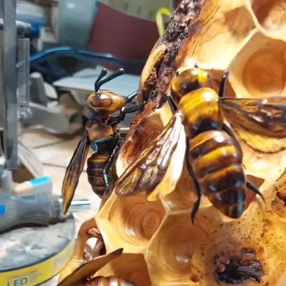 The lifelike details, despite being static wood carvings, give the illusion of movement. The wing patterns are clearly visible under a magnifying glass!🐝